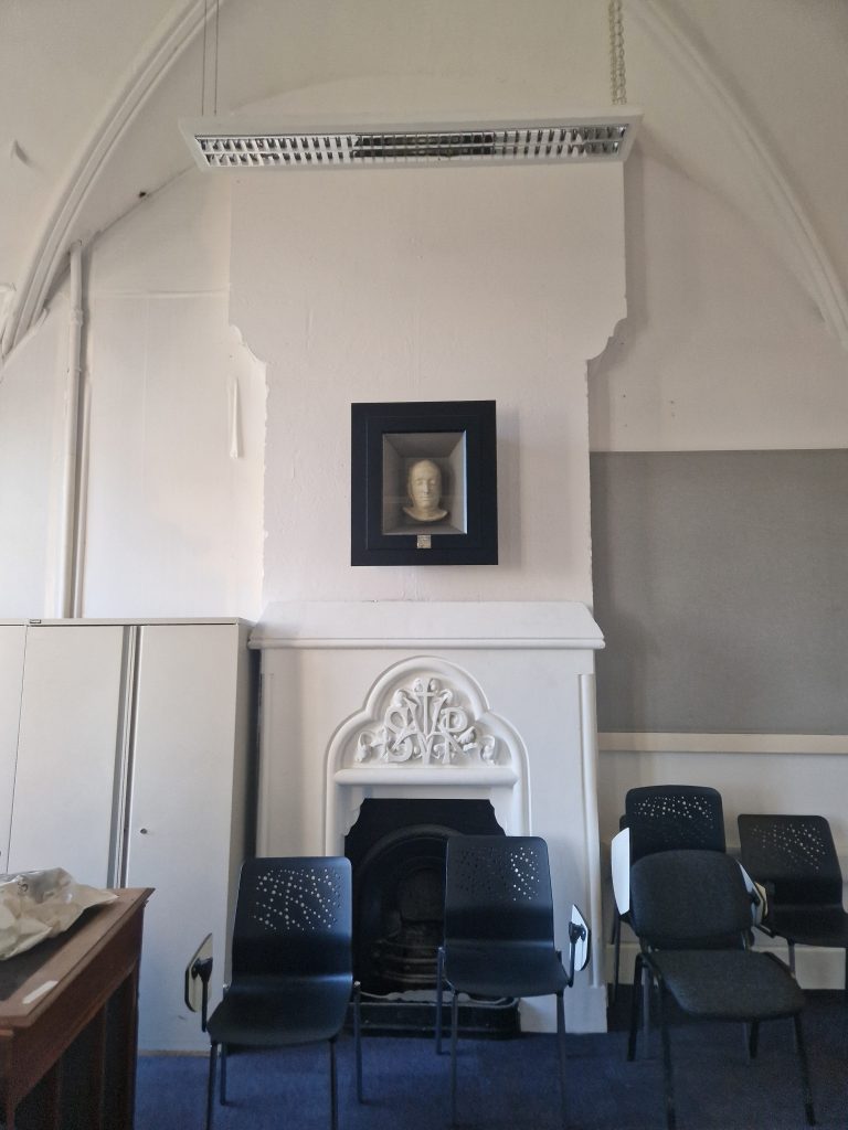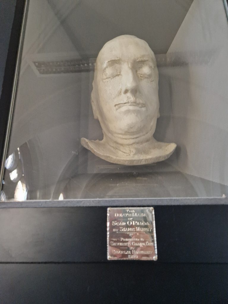 The piece starts with an establishing shot in the O’Riada Hall, UCC. The main theme from the Mise Eire soundtrack plays as background information scrolls over the images. In the foreground is a single microphone. We see close ups of Sean O’Riadas death mask and the plaque beneath it.